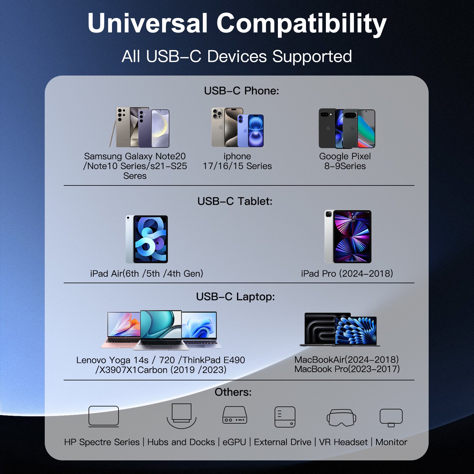 Universal Fit: Compatible with Thunderbolt 5/4/3/USB4/USB3.2/USB3.1/USB3.1/USB3.0/USB3.0, And All USB-C devices—MacBook, iPhone, PC, SSDs, Docks, eGPUs And more. Supports 80Gbps data transfer, dual 8K/4K display, and 240W fast charging for ultimate versatility.